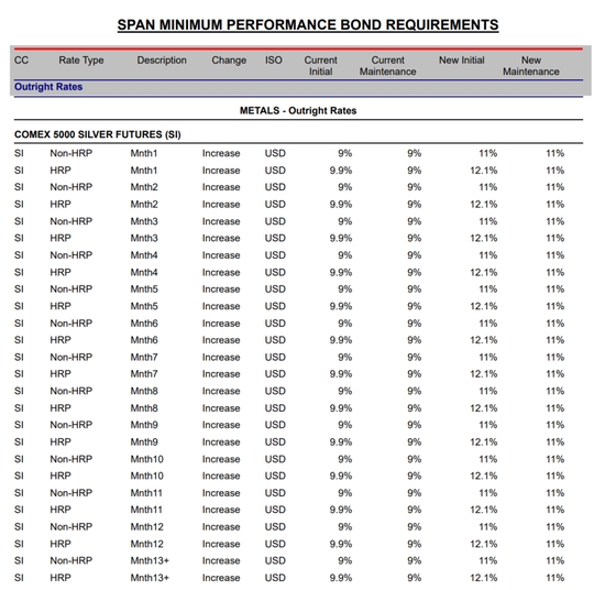 1月28日訊,芝加哥商品交易所(CME)當(dāng)?shù)貢r(shí)間27日發(fā)布通知,對(duì)部分白銀(8131, -9.00, -0.11%)、鉑金和鈀金期貨合約的保證金(Outright Rates)參數(shù)進(jìn)行調(diào)整。文件顯示,部分白銀合約的新保證金比例高于此前水平,約為名義價(jià)值的11%。新標(biāo)準(zhǔn)將于當(dāng)?shù)貢r(shí)間1月28日收盤后生效。本次通知未涉及黃金(582, 8.80, 1.54%)相關(guān)合約。
