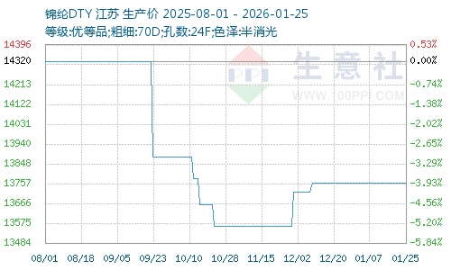 上周(2026年1月19日至25日),錦綸長絲價格處低位弱穩(wěn)。截止2026年1月25日,江蘇地區(qū)錦綸長絲DTY(優(yōu)等品;70D/24F)報價13760元/噸;錦綸POY(優(yōu)等品;86D/24F)報價11500元/噸;錦綸FDY(優(yōu)等品:40D/12F)價格報14275元/噸,與前期價格持平。