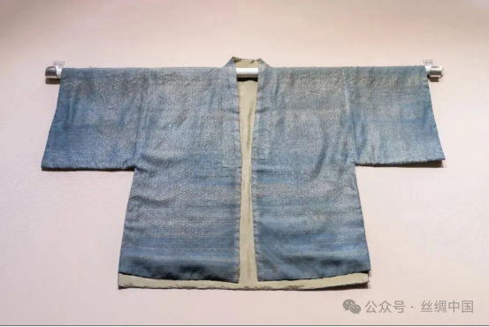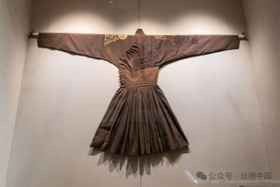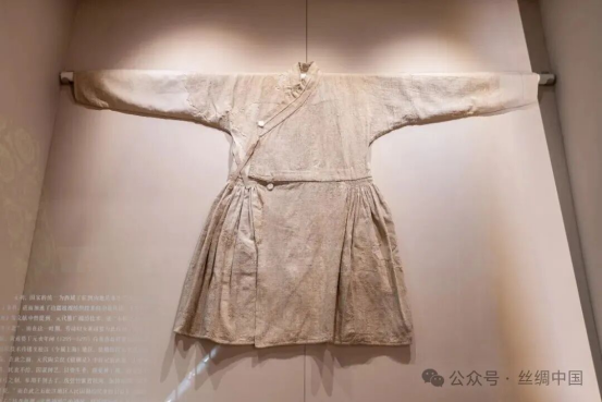 棉質(zhì),交領(lǐng),右衽,窄袖,束腰。右衽腋下有系帶,為本色絲絹,袍料以棉線為原材料,采用一上一下的平紋組織織造。經(jīng)緯線粗細不均勻,但整體織造較為規(guī)整,裁剪精良,做工細致。袍身為上衣下裳相連,上緊下松,袖口窄小。