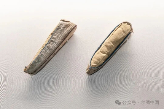 鞋幫由茶綠色絹鞋面、本色絹鞋里和紅棕色絹襯三部分組成。麻布鞋底為手工納底,針腳細密,腳心納成菱形圖案。鞋口鑲淺藍色絹邊,鞋后跟釘素絹提拔,鞋底周邊繼條為米白色絹,鞋底前端翹頭部分為淺綠色綺。鞋幫兩面對稱繡蓮花、牡丹和梅花,用弱捻的較粗絲線繡成。該藏品采用了打籽、接針、平繡、羼針等繡針法,繡工精細。據(jù)研究,這種鞋子應(yīng)該是“刀條兒鞋”。