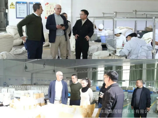 考察團(tuán)先后參觀了寧南縣五星級(jí)蠶?,F(xiàn)代農(nóng)業(yè)園區(qū)、桑枝食用菌基地、鮮繭智能收烘?zhèn)}儲(chǔ)中心、優(yōu)質(zhì)繭絲生產(chǎn)基地、有機(jī)絲綿加工基地、蠶桑副產(chǎn)物開(kāi)發(fā)基地等。通過(guò)聽(tīng)取介紹、實(shí)地察看、現(xiàn)場(chǎng)交流等方式,詳細(xì)了解寧南縣蠶桑產(chǎn)業(yè)規(guī)模化生產(chǎn)、桑枝食用菌生產(chǎn)、6A級(jí)生絲生產(chǎn)及蠶桑資源綜合開(kāi)發(fā)情況,RATTI SPA 集團(tuán)總經(jīng)理Sergio Tamborini表示寧南縣在生態(tài)環(huán)境保護(hù)、“栽桑養(yǎng)蠶—生絲制造—副產(chǎn)物開(kāi)發(fā)”全產(chǎn)業(yè)鏈質(zhì)量管控及原材料資源利用方面的成就給予高度評(píng)價(jià)。