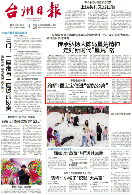 1月28日,記者走進(jìn)位于路橋區(qū)新橋鎮(zhèn)的浙江吉鴻繭業(yè)科技有限公司,室外氣溫5℃,但車間內(nèi)的溫度卻恒定在25℃。作為全市首個(gè)工廠化智能養(yǎng)蠶項(xiàng)目,這里正以日產(chǎn)蠶繭3噸、日產(chǎn)值20萬元的效率,打破“春蠶到死絲方盡”的季節(jié)性束縛,讓古老的蠶桑產(chǎn)業(yè)在寒冬里煥發(fā)出新的生機(jī)。