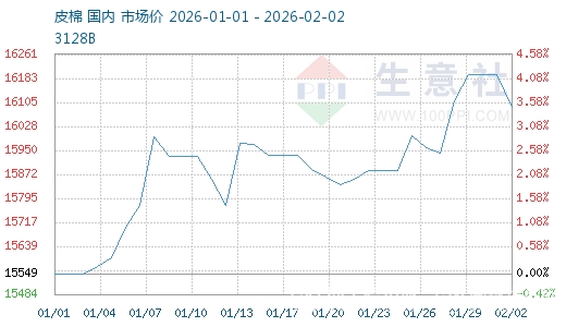 上周國內(nèi)棉價(jià)重心繼續(xù)抬升,幅度稍有收窄,國際棉價(jià)繼續(xù)下跌,內(nèi)外棉價(jià)差再創(chuàng)十年來新高。截至2月2日3128B級(jí)皮棉現(xiàn)貨價(jià)格在16090元/噸,較上周一上漲0.58%。