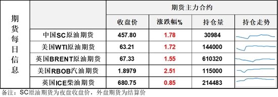 【1】WTI主力原油期貨收漲1.07美元,漲幅1.72%,報(bào)63.21美元/桶;布倫特主力原油期貨收漲1.03美元,漲幅1.55%,報(bào)67.33美元/桶;INE原油期貨收漲1.78%,報(bào)457.8元。
