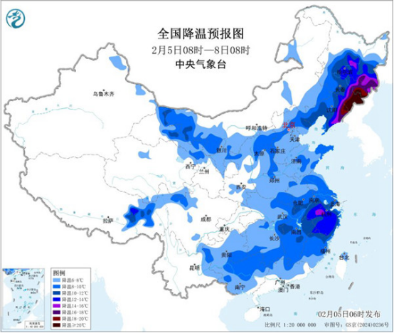 今起三天(2月5日至7日),寒潮將給中東部帶來明顯降溫,東北地區(qū)東部、江南東部降溫可超12℃,部分地區(qū)有初春重返寒冬的感覺。降溫的同時,今明天中東部還會迎來大范圍雨雪天氣,安徽中南部、江蘇中南部、浙江北部、上海等地的部分地區(qū)有大到暴雪。