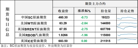 【1】WTI主力原油期貨收跌1.85美元,跌幅2.84%,報63.29美元/桶;布倫特主力原油期貨收跌1.91美元,跌幅2.75%,報67.55美元/桶;INE原油期貨收跌0.73%,報460.3元。