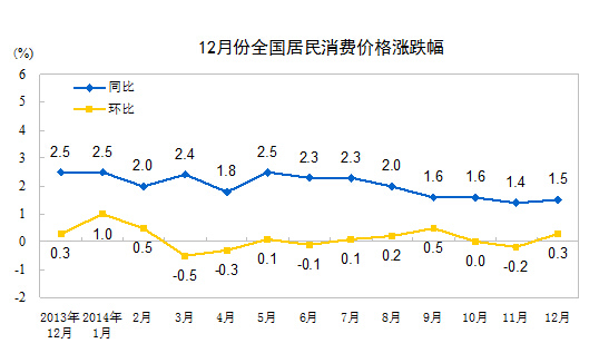 數(shù)據(jù)顯示,12月份,全國居民消費價格總水平同比上漲1.5%。其中,城市上漲1.6%,農(nóng)村上漲1.3%;食品價格上漲2.9%,非食品價格上漲0.8%;消費品價格上漲1.4%,服務(wù)價格上漲1.8%。對此,牛梨向中新網(wǎng)財經(jīng)頻道表示,12月份翹尾因素已經(jīng)逐漸消失,結(jié)構(gòu)調(diào)整已經(jīng)發(fā)揮作用。