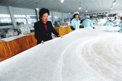 在《蠶絲被》國家標準起草單位、蘇州慈云蠶絲制品有限公司的車間里,她告訴記者,四人拉制的蠶絲被“全幅平面、縱橫旋轉、千層網疊、絲絲入扣”,全幅拉扯,縱橫交叉,上下包邊,四邊針絎,整條被子成型后,厚薄均勻,平坦、舒展、柔軟、蓬松、四角方正、四邊充實、差異率不大于10%,完全達到《蠶絲被》國家標準中優(yōu)等品的要求。