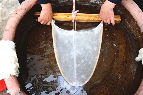 上好的太湖流域雙宮繭經過脫膠,去蛹、剝綿(上繃脫繃)、晾曬、扯綿這些工序之后,就到了翻扯成胎這一步。傳統(tǒng)的翻扯成胎是以兩張方桌或板桌為工作臺,兩人相對將綿條扯開,扯松攤平,橫豎層層疊加交叉,到邊到位使之復合至一定重量和一定幅寬、幅長,即做成絲綿被胎,這一道是最終工序,關鍵是兩人動作協(xié)調,用力平衡,剛中帶柔,拉住綿塊用力適度,慢慢放開,使蠶絲纖維像一層輕薄的絲網全面覆蓋。沈福珍在傳承父輩傳統(tǒng)工藝的過程中,經過多年的實踐,將兩人拉扯改為四人拉制的蠶絲被拉制法。