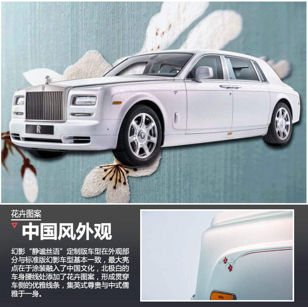 幻影“靜謐絲語(yǔ)”定制版車型在外觀部分的線條處理上與標(biāo)準(zhǔn)版幻影相一致,更多的是在幻影車型基礎(chǔ)上融入了中國(guó)文化,在勞斯萊斯手工匠人耗費(fèi)12個(gè)小時(shí)而打造的珠光漆表面,添加花卉圖案的腰線作為點(diǎn)綴,形成貫穿車側(cè)的優(yōu)雅線條,集英式尊貴與中式儒雅于一身。