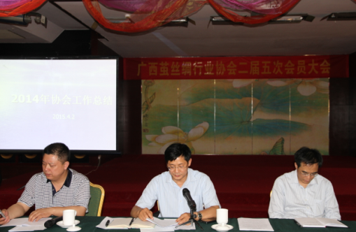 2015年4月2日,廣西繭絲綢行業(yè)協(xié)會(huì)二屆五次會(huì)員大會(huì)在南寧召開,協(xié)會(huì)各會(huì)員單位領(lǐng)導(dǎo)出席本次會(huì)議,自治區(qū)繭絲辦楊富剛處長到會(huì)指導(dǎo)。會(huì)議審議了協(xié)會(huì)2014年工作總結(jié)和2015年工作安排意見,并交流探討當(dāng)前行業(yè)市場(chǎng)行情,分析我區(qū)各地春繭生產(chǎn)情況,引導(dǎo)企業(yè)做好春繭收購工作;協(xié)會(huì)還邀請(qǐng)到自治區(qū)國稅局專家對(duì)《繅絲加工行業(yè)試行農(nóng)產(chǎn)品增值稅進(jìn)項(xiàng)稅額扣除辦法》進(jìn)行講解。