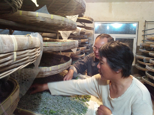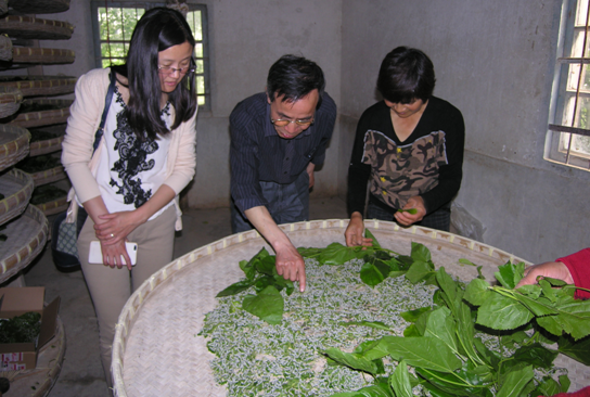 圖為朱嘉燕副局長與蠶桑技術人員一起在養(yǎng)蠶示范戶李付林家現(xiàn)場指導