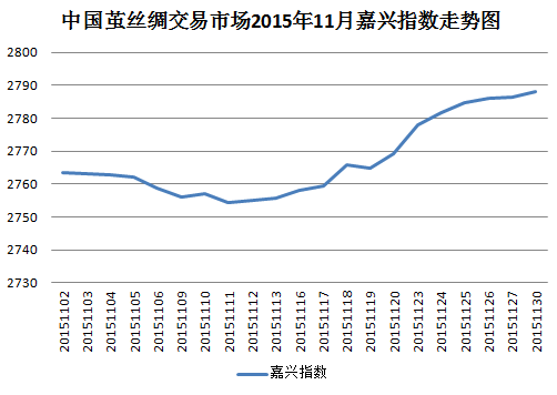 2015年11月,中國·嘉興指數(shù)呈現(xiàn)微幅反彈態(tài)勢,較上月環(huán)比上漲0.82%報收于2788.11點。據(jù)監(jiān)測,中國繭絲綢交易市場電子盤面現(xiàn)貨月干繭11月底價格微漲0.12%報收于8.47萬/噸,B絲(商檢3A級生絲)價格環(huán)比上漲2.06%報收于29.73萬元/噸;遠(yuǎn)期代表性合約160325B絲環(huán)比上漲0.79%報收于30.63萬元/噸,160325干繭報收于8.7萬元/噸與上月持平;市場內(nèi)代表性綢緞交易品種12101雙縐成交價格在32.17~33.83元/米,14654素縐緞成交價格在45.83~48.17元/米,與上月相比略有下跌。機(jī)制蛹襯絲綿成交價格大致在23萬元/噸上下波動。
