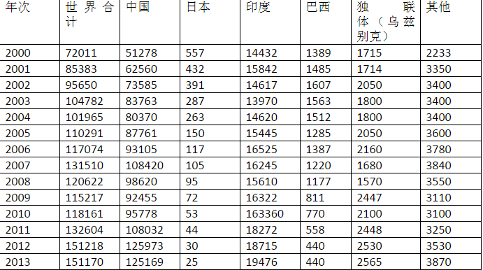2000-2013年世界桑蠶生絲生產(chǎn)量