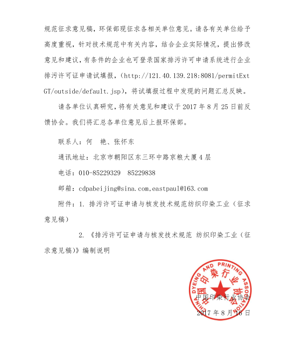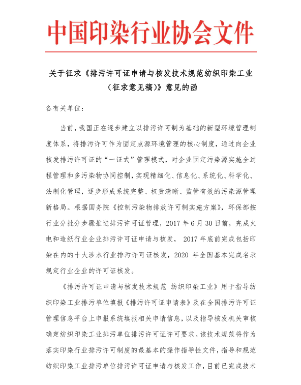 中國印染行業(yè)協(xié)會關于征求《排污許可證申請與核發(fā)技術規(guī)范 紡織印染工業(yè)》意見的函