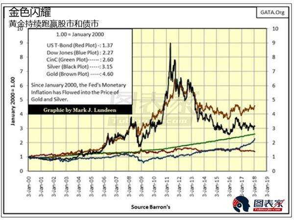 最后,我們將美國債券,股票,白銀和黃金與流通貨幣進(jìn)行比較。令人意外的是,自2000年以來,黃金的表現(xiàn)跑遠(yuǎn)勝于股票和債券市場。即使是18年的白銀,也跑贏了股市。20世紀(jì)70年代后期推動黃金和白銀走高的是通貨膨脹。在瘋狂的QE后全球再次迎來通脹,歷史現(xiàn)狀即將重演,資金將會流向商品市場。而當(dāng)商品處于牛市時,黃金和白銀往往會發(fā)光。