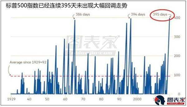 這張圖顯示美國股票市場牛市中出現(xiàn)超過5%或的時間平均為牛市上漲開始后的92天。在20世紀(jì)90年代中期,美股超過394天沒有出現(xiàn)5%的修正,隨后就發(fā)生了股災(zāi),股價一路暴跌。而現(xiàn)在美股創(chuàng)下了創(chuàng)下了399天沒有大幅回調(diào)的牛市紀(jì)錄。因此,標(biāo)普500指數(shù)從未變得如此危險,單單從統(tǒng)計意義上來講,接下來股市出現(xiàn)回調(diào)的概率極大。