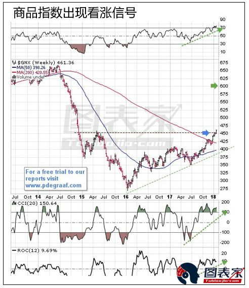 技術(shù)層面也出現(xiàn)了令人振奮的消息,圖為GNX商品指數(shù)。該指數(shù)正在突破上方450的前方高點(diǎn)阻力。指數(shù)已經(jīng)突破200周均線,出現(xiàn)強(qiáng)烈看漲信號,這意味著商品從技術(shù)層面來看即將迎來牛市。