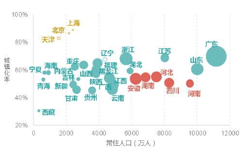 紅色氣泡表示的河南、四川、河北、湖南、安徽五個(gè)省屬于人口規(guī)模較大,在全國(guó)居前列,但城鎮(zhèn)化率并不高(低于全國(guó)平均城鎮(zhèn)化率水平)的省份,這類(lèi)省份的人口優(yōu)勢(shì)在未來(lái)會(huì)得到進(jìn)一步顯現(xiàn),這五個(gè)省的省會(huì)城市也是我們認(rèn)為未來(lái)會(huì)有大量人口流入的城市。