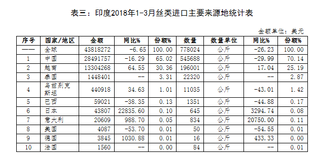 從印度進(jìn)口來看,根據(jù)中國紡織品進(jìn)出口商會的數(shù)據(jù),今年1-3月,印度絲綢商品進(jìn)口額為1.35億美元,同比增長31.09%;出口額為7.95億美元,同比下降22.76%。剔除匯率波動的因素,印度絲綢的出口同樣不是很樂觀。如果這部分貨值不能在印度國內(nèi)有效消化,會影響3月后中國對印度的出口,這已經(jīng)在這幾個月的出口情況大致已經(jīng)反映出來。不過要更加關(guān)心的是目前后期的形勢變化。