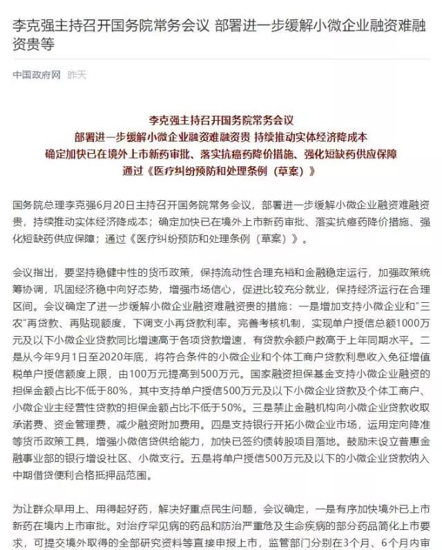- 6月20日,國務(wù)院總理主持召開國務(wù)院常務(wù)會議,部署進一步緩解小微企業(yè)融資難融資貴,持續(xù)推動實體經(jīng)濟降成本;會議指出,要堅持穩(wěn)健中性的貨幣政策,保持流動性合理充裕和金融穩(wěn)定運行,加強政策統(tǒng)籌協(xié)調(diào),鞏固經(jīng)濟穩(wěn)中向好態(tài)勢,增強市場信心,促進比較充分就業(yè),保持經(jīng)濟運行在合理區(qū)間。