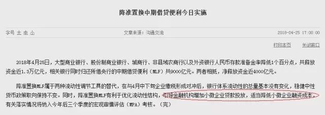 今年4月17日,央行宣布,從4月25日起,下調(diào)部分金融機構(gòu)人民幣存款準備金率1個百分點。央行的官方文件中就提到了“增加小微企業(yè)貸款投放,降低小微企業(yè)融資成本”等話語。