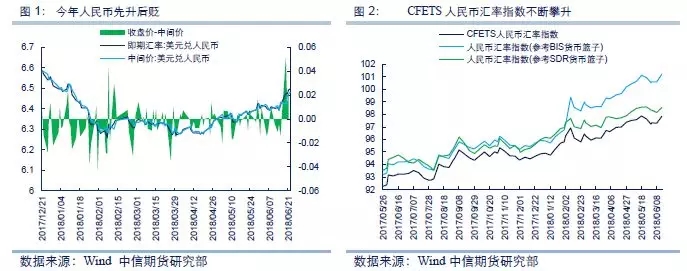 從美元兌人民幣中間價(jià)的分解來(lái)看,前期在外部美元指數(shù)升值的背景下,人民幣對(duì)美元匯率主要體現(xiàn)為被動(dòng)貶值特征。這一點(diǎn)從反映內(nèi)部外匯市場(chǎng)供求的收盤價(jià)因素對(duì)中間價(jià)的貢獻(xiàn)主要為升值方向,而中間價(jià)的貶值主要由反映外部市場(chǎng)變化的隔夜一籃子貨幣因素所貢獻(xiàn)可以看出。這一點(diǎn)從6月中旬之前,CFETS人民幣匯率指數(shù)不斷攀升也可以得到印證。