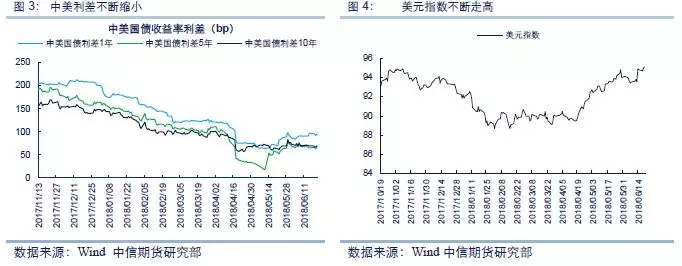 外部壓力猶存。美國(guó)經(jīng)濟(jì)目前強(qiáng)勢(shì)復(fù)蘇,歐元區(qū)雖整體復(fù)蘇程度不及預(yù)期,但依然會(huì)在今年12月退出QE。目前來(lái)看,美國(guó)今年加息4次預(yù)期逐漸增強(qiáng),將會(huì)進(jìn)一步帶動(dòng)美元指數(shù)增強(qiáng)。外部經(jīng)濟(jì)體的強(qiáng)勁將使得人民幣繼續(xù)受到貶值的壓力。另外,從目前的情況來(lái)看,中美利差或?qū)⒗^續(xù)減小,預(yù)計(jì)長(zhǎng)期低于前期所說(shuō)的80~100bp中美利差舒適區(qū)。