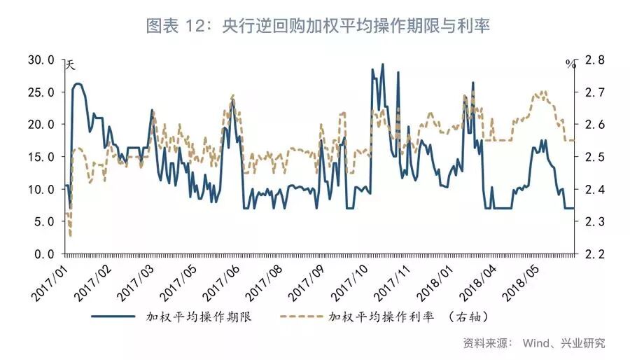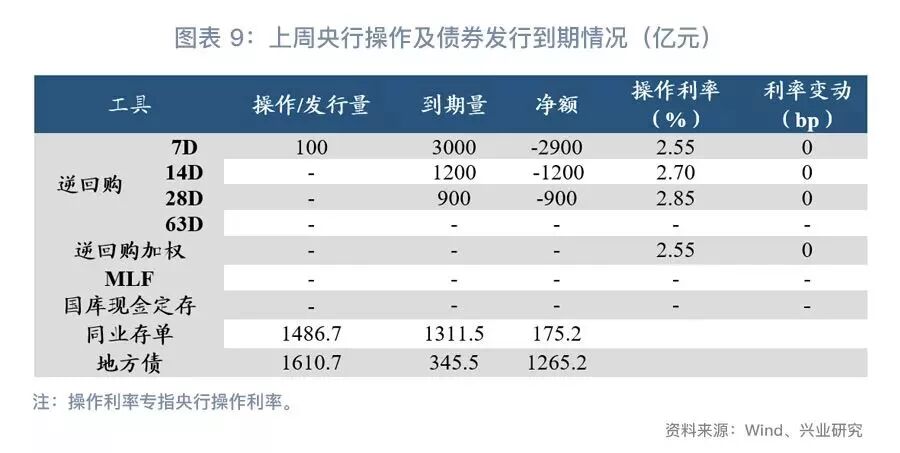 公開(kāi)市場(chǎng)操作方面,在季末財(cái)政支出和降準(zhǔn)的雙重影響下,上周資金面較為寬松,能夠吸收逆回購(gòu)到期等因素的影響,因此央行在公開(kāi)市場(chǎng)凈回籠5000億(圖表9);截至上周末,逆回購(gòu)余額下降至1300億(圖表11)??紤]到時(shí)值月初,上周僅進(jìn)行7天逆回購(gòu)操作,操作期限與前一周持平;加權(quán)平均操作利率為2.55%,與前一周持平(圖表12)。