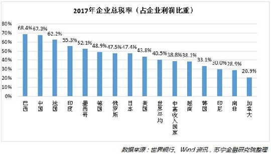 間接稅主導(dǎo)的稅制結(jié)構(gòu),是我國企業(yè)部門稅費負擔(dān)過重的關(guān)鍵原因。從世界銀行發(fā)布的可比數(shù)據(jù)看,中國企業(yè)部門總稅率(占企業(yè)利潤比重)2017年高達67.3%,既高于美國、日本、德國等發(fā)達國家的企業(yè)總稅率,也高于印尼、南非、印度、俄羅斯和越南等發(fā)展中國家的企業(yè)總稅率。