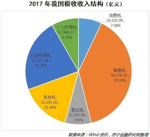 企業(yè)部門的高稅負,與我國的稅制結(jié)構(gòu)有較大關(guān)系。當(dāng)前,我國稅收收入是以間接稅為主,增值稅、營業(yè)稅、消費稅三大稅種均為間接稅,2017年三者累計占比在54.1%,這些都是企業(yè)繳納的稅種;直接稅包括所得稅和財產(chǎn)稅類,主要有個人所得稅、企業(yè)所得稅、房產(chǎn)稅、契稅、車船稅、車輛購置稅等,其中個人所得稅和企業(yè)所得稅累計占比為37.6%(參見下圖),而在歐美等多數(shù)國家,直接稅占比均在70%-90%之間。