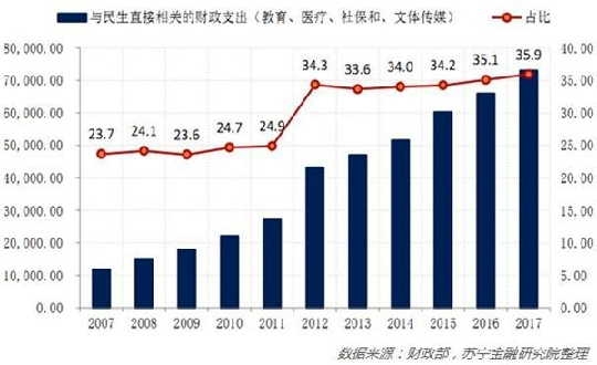 其次是財政剛性支出的難題。我國財政預(yù)算是“以支定收”的模式,每年預(yù)算安排兩會期間經(jīng)人大審議后,本年度可更改的空間不大。一般公共預(yù)算方案既會明確當(dāng)年稅收收入目標(biāo)增速,也有明確的財政赤字率、中央和地方政府債券、專項債發(fā)行規(guī)模。另外,財政支出剛性,也限制了大幅減稅的空間。特別是民生支出只增不減,如2017年與民生直接相關(guān)的教育、醫(yī)療衛(wèi)生、社保和就業(yè)、文體傳媒四項合計支出占全部財政支出比重達到 35.9%,在過去的 10 年內(nèi)上升了12個百分點(參見下圖)。與此同時,人口老齡化加速到來,也將限制宏觀稅負的下行空間。