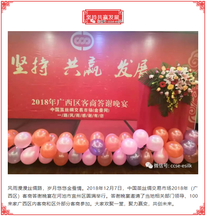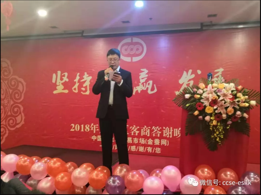 劉總在致辭中表示,中國繭絲綢交易市場是一家專注于絲綢行業(yè)的公共平臺,經(jīng)過20多年的發(fā)展,已成為絲綢行業(yè)重要的交易、信息樞紐,目前注冊瀏覽市場交易的國外客戶640多家,遍及絲綢大宗產(chǎn)品的主要出口國。過去,繭絲的交易價(jià)格,只有收繭企業(yè),繅絲廠關(guān)心,最近的一二年,我們明顯的感覺到綢廠、服裝廠,國外客戶也是時(shí)刻在關(guān)注。說明大家對信息是重視了!由于關(guān)注信息,正確把握行情走勢,有些企業(yè)在今年行業(yè)普遍困難的情況下,取得了良好的經(jīng)濟(jì)效益!我們根據(jù)行業(yè)的需求,17年在湖州開設(shè)中國繭絲綢交易市場生絲超市,今年有50多家繅絲企業(yè)、140多家的綢廠在生絲超市這個(gè)平臺上進(jìn)行現(xiàn)款銷售和采購。19年,我們準(zhǔn)備在宜州開設(shè)中國繭絲綢交易市場蠶繭超市。同時(shí),引進(jìn)中國纖維檢驗(yàn)、商檢等第三方機(jī)構(gòu),提供大家公正、透明的交易環(huán)境,來幫助大家釆購合適的原料。這一過程,我們提供配套的供應(yīng)鏈金融服務(wù)。最后,提供給企業(yè)各種絲綢資訊,幫助企業(yè)減少因市場變化而導(dǎo)致的價(jià)格波動帶來的市場風(fēng)險(xiǎn)。我們通過提供一系列的服務(wù),為的是給大家一個(gè)更好的賺錢機(jī)會和高效的流通平臺。最后,再次感謝大家的光臨,借此機(jī)會,提前預(yù)祝大家在新的一年里身體健康,賺錢多多,謝謝!