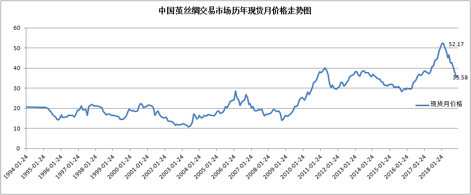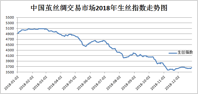 今日是2018年的最后一個(gè)交易日,主力合約以紅盤(pán)報(bào)收。2018年,生絲指數(shù)累計(jì)下跌25.6%?,F(xiàn)貨月價(jià)格從年初50.31萬(wàn)下跌至36萬(wàn),累計(jì)下跌28.4%。但在連續(xù)收出陰線后,本月生絲指數(shù)難得劃出低位陽(yáng)線。