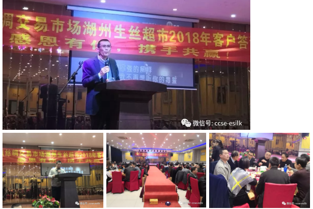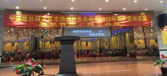 12月18日,中國繭絲綢交易市場湖州生絲超市2018年客戶答謝晚宴在重兆村隆重舉行。近兩百名絲綢企業(yè)家蒞臨現(xiàn)場,氣氛熱烈。晚宴由區(qū)域總監(jiān)陳錦明主持,他感謝各位的支持和厚愛,使得湖州生絲超市的業(yè)務(wù)得到較快的拓展。