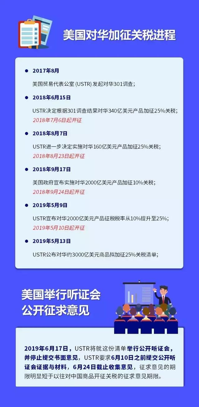 2019年5月13日,美國(guó)貿(mào)易代表辦公室(USTR)公布對(duì)約3250億美元中國(guó)商品擬加征25%關(guān)稅清單(簡(jiǎn)稱清單4),涉及我國(guó)紡織行業(yè)對(duì)美出口比重較大的服裝(HS61、62章)和大部分家用紡織品(HS63、94章)以及部分紡織機(jī)械產(chǎn)品(HS84章),涉及我行業(yè)對(duì)美年出口金額超過(guò)400億美元產(chǎn)品。目前美國(guó)正在就該清單征求公眾意見(jiàn),并將于6月17日舉行公開聽證會(huì)。對(duì)于是否正式針對(duì)該3000億美元中國(guó)商品清單加征25%關(guān)稅,還將在公開聽證會(huì)征求意見(jiàn)后,結(jié)合中美貿(mào)易談判的最新進(jìn)展情況而定。