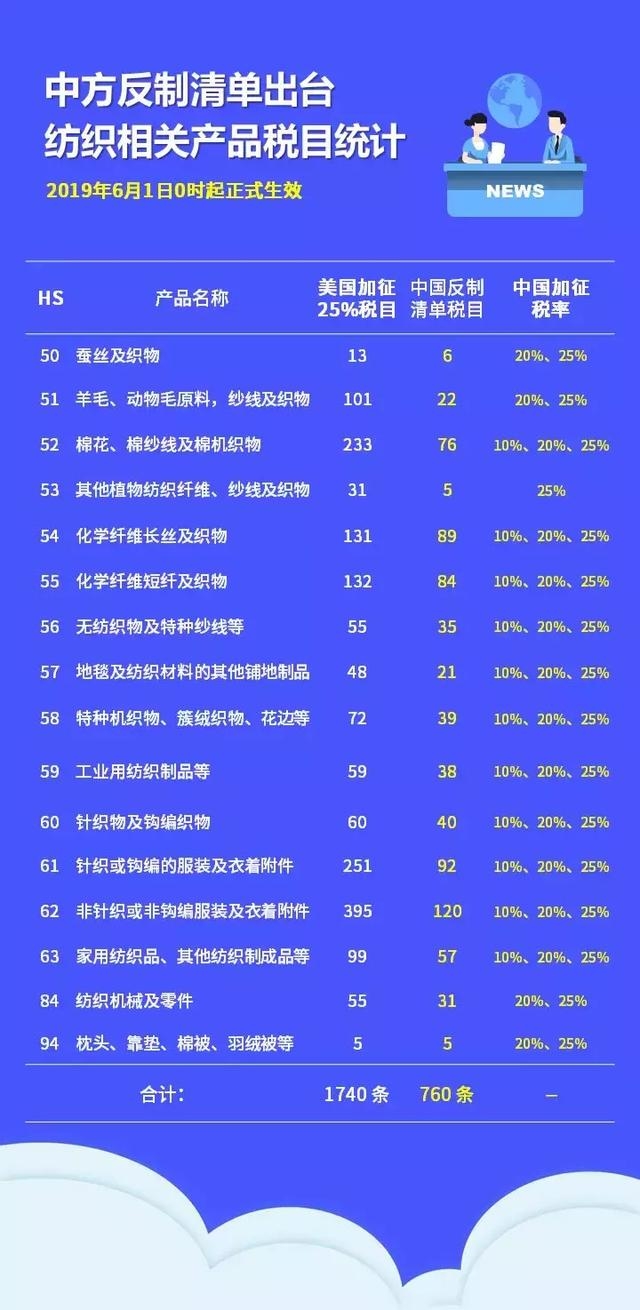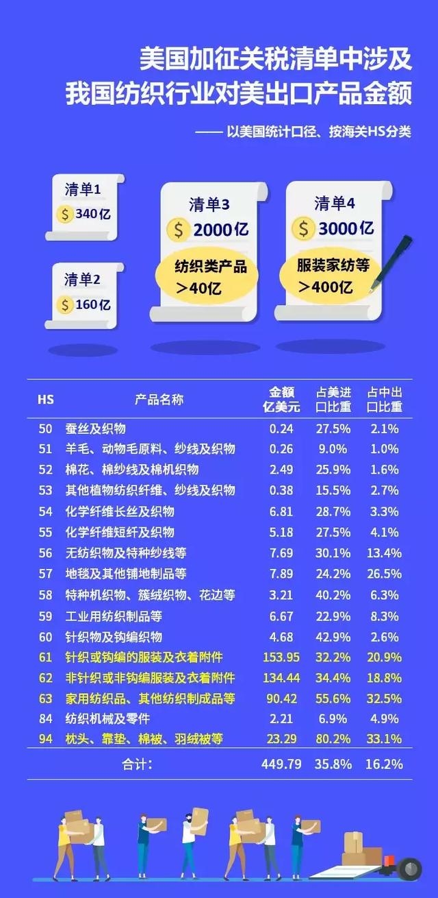 此前5月9日,美國(guó)政府宣布自2019年5月10日起,對(duì)從中國(guó)進(jìn)口的2000億美元清單商品(簡(jiǎn)稱清單3)加征的關(guān)稅稅率由10%提高到25%,其中已經(jīng)包括了幾乎全部種類的紡織紗線、織物、針織、產(chǎn)業(yè)用制成品及部分家用紡織品和紡織機(jī)械產(chǎn)品,這些產(chǎn)品對(duì)美年出口額逾40億美元,至此兩份清單以互補(bǔ)的形式幾乎覆蓋了我行業(yè)全部對(duì)美出口的紡織服裝產(chǎn)品,總額約450億美元?!?/span>