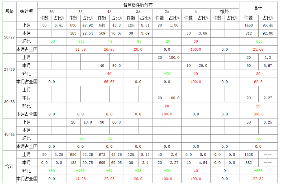 按生絲規(guī)格統(tǒng)計: 20/22 規(guī)格 812 件,占比 92.06%,占全國總量 21.08%,環(huán)比減少 656 件;27/29 規(guī)格 50 件,占比 5.67%,占全國總量 62.5%,環(huán)比增加 30 件;本月新增 30/33 規(guī)格 20 件,占比 2.27%,占全國總量 100.0%,環(huán)比增加 20 件;本月沒有 40/44 規(guī)格,環(huán)比減少 50 件。