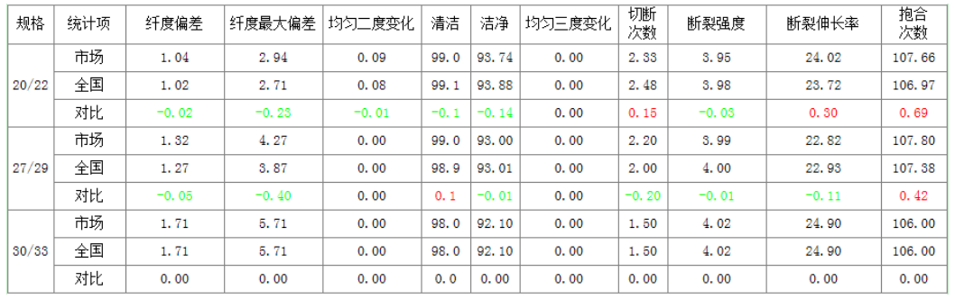 20/22 規(guī)格的產(chǎn)品,本市場生絲超市產(chǎn)品優(yōu)于全國平均水平的指標有:切斷、斷裂伸長率,與全國平均水平持平的指標有:纖度偏差、均勻二度變化、清潔、均勻三度變化、斷裂強度、抱合,略低于全國平均水平的指標有:纖度最大偏差、潔凈。