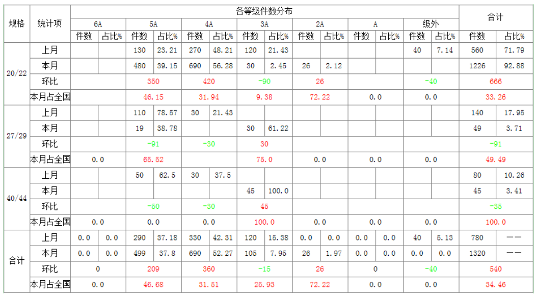 按生絲規(guī)格統(tǒng)計: 20/22 規(guī)格 1226 件,占比 92.88%,占全國總量 33.26%,環(huán)比增加 666 件;27/29 規(guī)格 49件,占比 3.71%,占全國總量 49.49%,環(huán)比減少 91 件;40/44 規(guī)格 45 件,占比 3.41%,占全國總量 100.0%,環(huán)比減少 35 件。