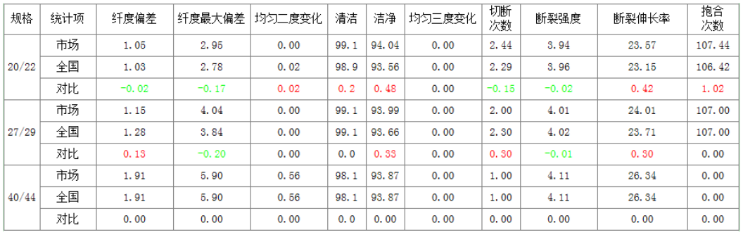 20/22 規(guī)格的產(chǎn)品,本市場生絲超市產(chǎn)品優(yōu)于全國平均水平的指標有:清潔、潔凈、斷裂伸長率、抱合,與全國平均水平持平的指標有:纖度偏差、均勻二度變化、均勻三度變化、斷裂強度、,略低于全國平均水平的指標有:纖度最大偏差、切斷。