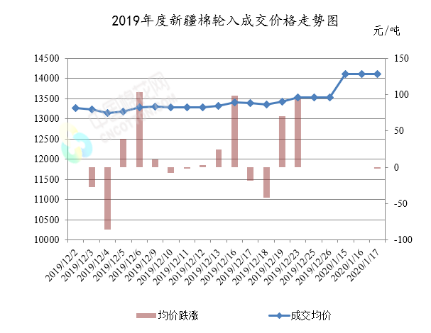 1月17日,中國儲備棉管理有限公司掛牌采購新疆棉7000噸,成交均價14105元/噸。