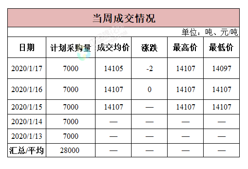 截至1月17日,累計掛牌采購23.8萬噸,累計成交最高價14107元/噸,累計成交最低價12879元/噸。