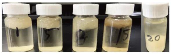 (b) 聚甲基丙烯酰胺接枝增重的蠶絲絲綿溶解后狀態(tài)