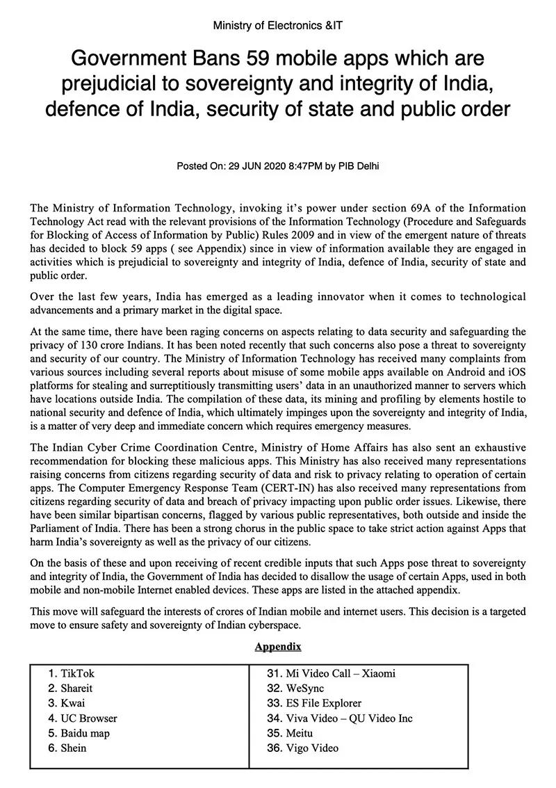 印度信息技術部,根據(jù)《信息技術法案》第69A條閱讀與信息技術的相關規(guī)定,結(jié)合《信息技術(阻止公眾獲取信息的程序和保障措施)規(guī)則》相關規(guī)定,針對緊急威脅的性質(zhì),決定59款應用程序,因為根據(jù)現(xiàn)有信息,它們從事的活動有損印度的主權(quán)和完整性、國防、國家安全和公共秩序。
