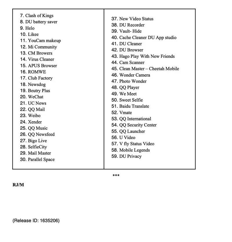 基于這些和最近收到的可靠消息,這些應用對印度的主權(quán)和完整構(gòu)成威脅,印度政府決定禁止在移動和非移動互聯(lián)網(wǎng)設備使用某些應用。這些應用程序已列在附件中。此舉將保護印度移動和互聯(lián)網(wǎng)用戶的利益。這一決定是為確保印度網(wǎng)絡安全和主權(quán)而采取的有針對性的措施。
