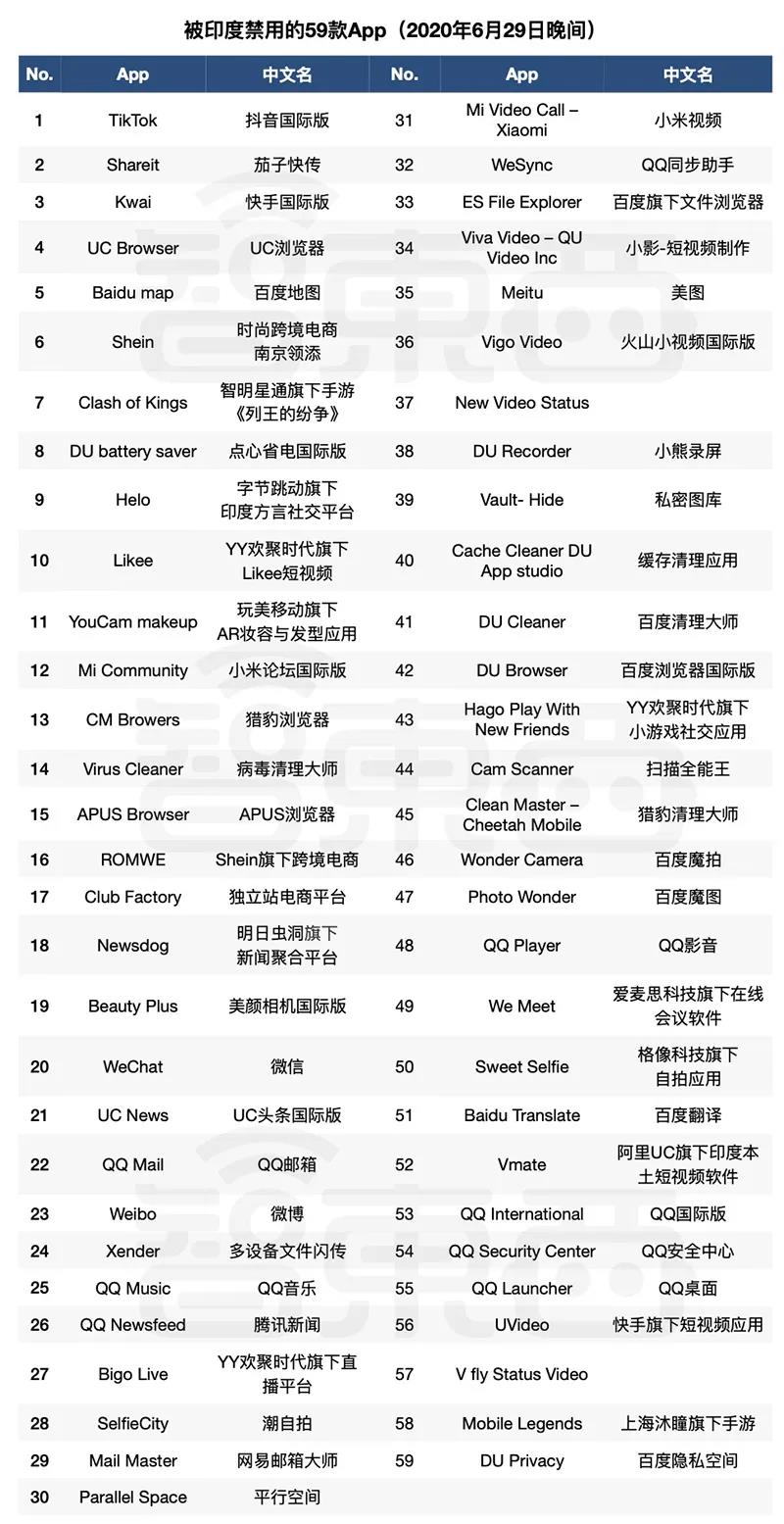 6月30日消息,印度信息技術部昨夜突然宣布,出于國家安全的考慮,禁用59款中國App。