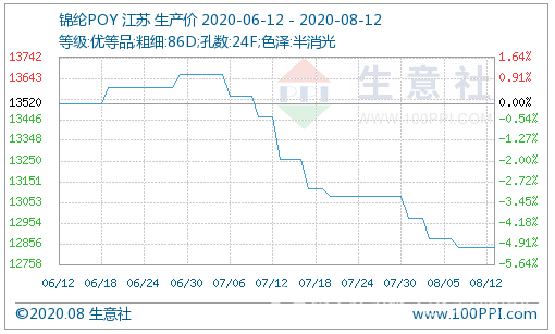 據(jù)生意社數(shù)據(jù)統(tǒng)計,截止到8月12日,江蘇地區(qū)錦綸長絲DTY報15066元/噸,較8月1日價格下跌234元/噸,跌幅1.53%,同比下跌16.76%;錦綸POY價格報12840元/噸,價格下跌140元/噸,跌幅1.08%,同比下跌18.32%;錦綸FDY價格報15750元/噸,價格下400元/噸,跌幅2.48%,同比下跌21.05%。
