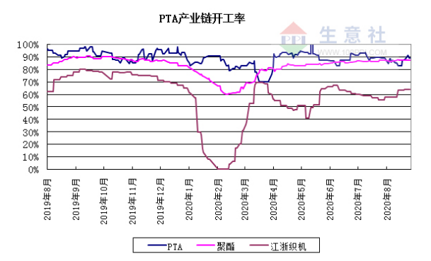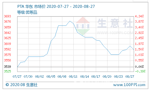 受熱帶風(fēng)暴影響,墨西哥灣近海原油產(chǎn)量減少80%以上,并導(dǎo)致一些煉油廠減產(chǎn),原油階段性高點(diǎn),截止8月27日,美國(guó)WTI原油期貨主力合約結(jié)算價(jià)報(bào)43.37美元/桶,布倫特原油期貨主力合約結(jié)算價(jià)報(bào)45.64美元/桶。PTA市場(chǎng)價(jià)格繼續(xù)小幅攀升,截止8月26日市場(chǎng)均價(jià)在3603元/噸,周環(huán)比上漲0.31%,同比下跌30.95%。 裝置方面,虹港石化150萬(wàn)噸、寧波臺(tái)化120萬(wàn)噸、揚(yáng)子石化65萬(wàn)噸分別于8月17日、20日、21日升溫重啟。福海創(chuàng)450萬(wàn)噸也于8月20日滿負(fù)荷運(yùn)行,PTA開(kāi)工負(fù)荷提升至91%以上。但隨著上海亞?wèn)|石化70萬(wàn)噸、華彬石化140萬(wàn)噸降幅檢修,開(kāi)工率下降至89%以下。庫(kù)存方面,截止7月末,國(guó)內(nèi)PTA的庫(kù)存量高達(dá)363.73萬(wàn)噸,而至8月20日下滑至356.31萬(wàn)噸,提振市場(chǎng)心態(tài)。