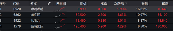 餐飲股集體飆升,呷哺呷哺(9.99, 0.90, 9.90%)漲10%,海底撈(52.5, 2.80, 5.63%)漲5.6%,再創(chuàng)新高,九毛九(18.46, 0.88, 5.01%)漲5%,頤海國際(126.4, 5.20, 4.29%)漲4%。業(yè)內(nèi)人士認為,隨著下半年餐飲行業(yè)進入旺季,頭部的餐飲企業(yè)享受資本的紅利屬于正?,F(xiàn)象。相比之下,中小餐飲企業(yè)則迎來了“關店潮”。大型的龍頭餐飲企業(yè)在品牌、資金、供應鏈和抗風險能力等方面的實力,是中小餐飲企業(yè)所無法比擬的。也正因此,在疫情期間,龍頭餐飲企業(yè)得以繼續(xù)擴張。